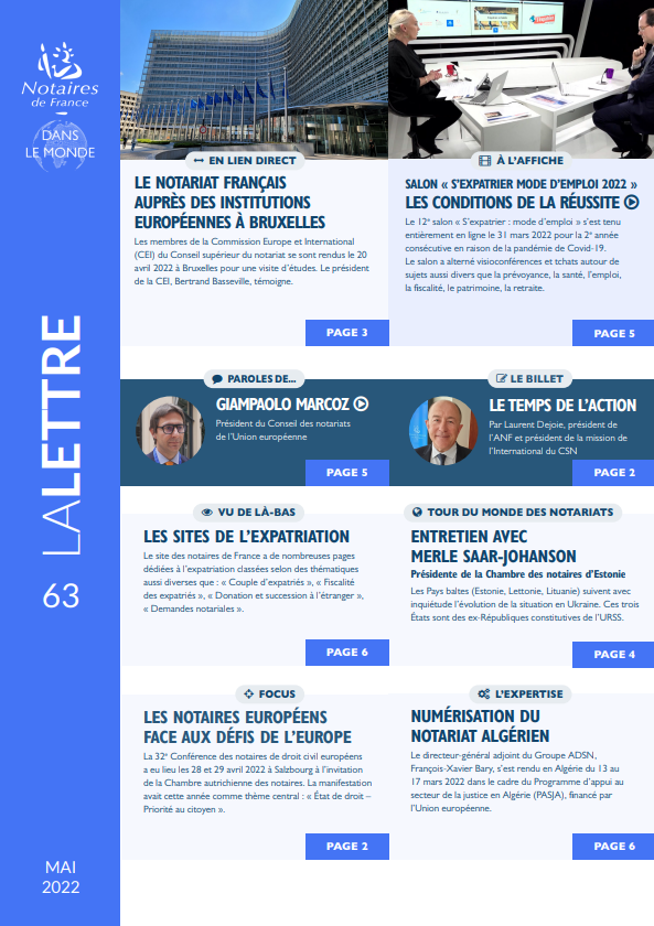 La lettre des notaires de France dans le monde de Mai 2022 traite de la numérisation du notariat en Algérie, de la visite d'étude de la Commission Eurpoe et International à Bruxelles...